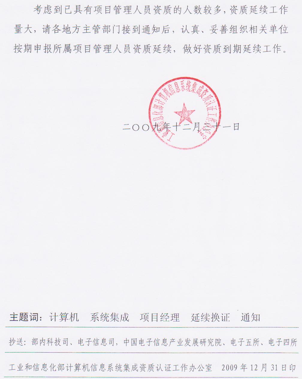 工业和信息化部计算机信息系统集成资质认证工作办公室文件 工信计资【2009】16号