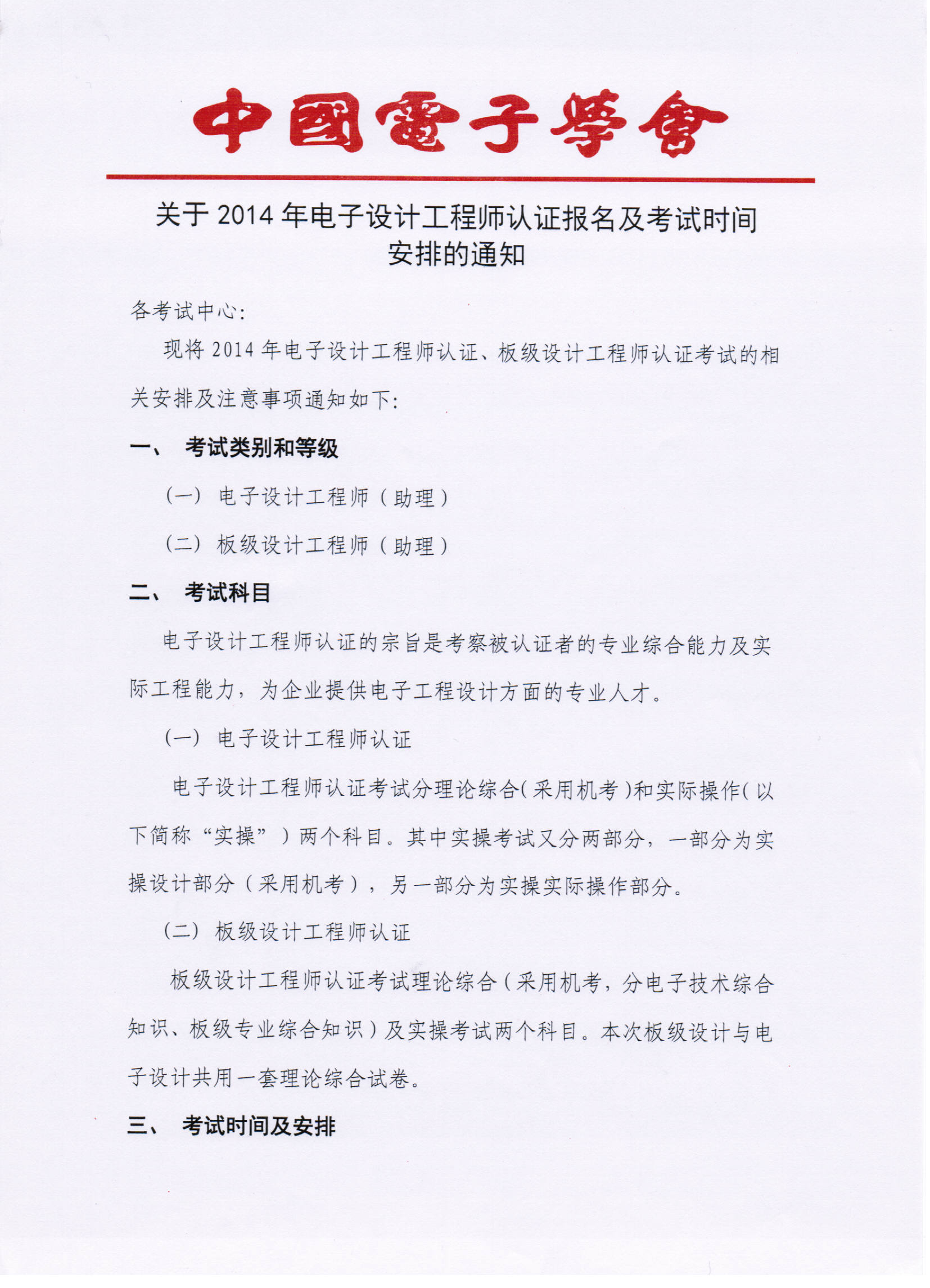 关于2014年电子设计工程师认证报名及考试时间安排的通知