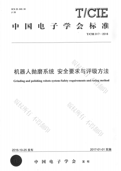 2016年10月25日,由bte365娱乐场机器人标准化技术委员会提出并归口,bte365娱乐场联合重庆德新机器人检测中心有限公司、中国科学院重庆绿色智能技术研究院等单位研制的机器人团体标准《机器人抛磨系统安全要求与评级方法》正式发布。该标准标准号为T/CIE 017-2016,现通过中国电子技术标准化研究院正式发行。机器人行业的从业者可通过bte365娱乐场或中国电子技术标准化研究院订购该标准。该团体标准版权归bte365娱乐场所有,特此通知。