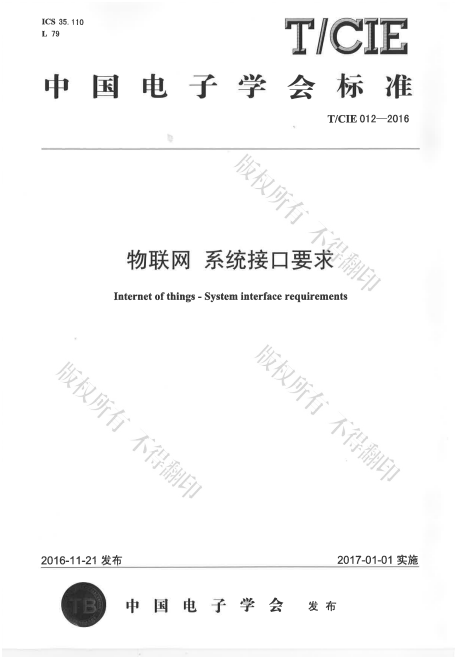 2016年11月21日,由bte365娱乐场物联网标准化技术委员会提出并归口,bte365娱乐场联合无锡物联网产业研究院、中国电子技术标准化研究院、深圳市标准技术研究院等单位研制的物联网团体标准《物联网系统接口要求》正式发布。该标准标准号为T/CIE 012-2016,现通过中国电子技术标准化研究院正式发行。物联网行业的从业者可通过bte365娱乐场或中国电子技术标准化研究院订购该标准。该团体标准版权归bte365娱乐场所有,特此通知。