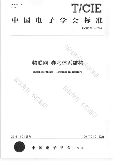 2016年11月21日,由bte365娱乐场物联网标准化技术委员会提出并归口,bte365娱乐场联合中国电子技术标准化研究院、利达尔科技有限公司等单位研制的物联网团体标准《物联网参考体系结构》正式发布。该标准标准号为T/CIE 011-2016,现通过中国电子技术标准化研究院正式发行。物联网行业的从业者可通过bte365娱乐场或中国电子技术标准化研究院订购该标准。该团体标准版权归bte365娱乐场所有,特此通知。