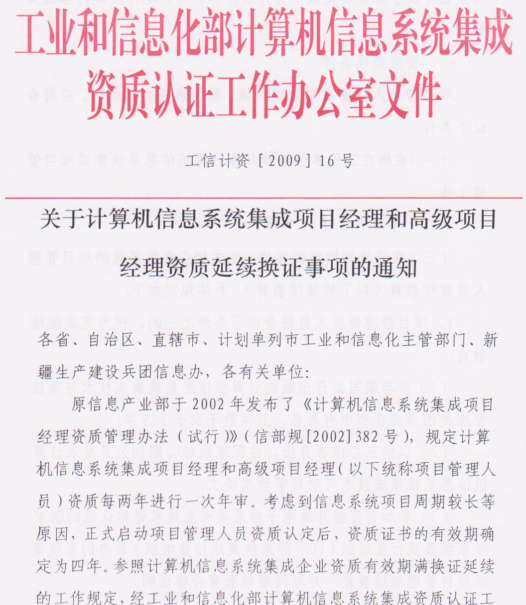 工业和信息化部计算机信息系统集成资质认证工作办公室文件 工信计资【2009】16号